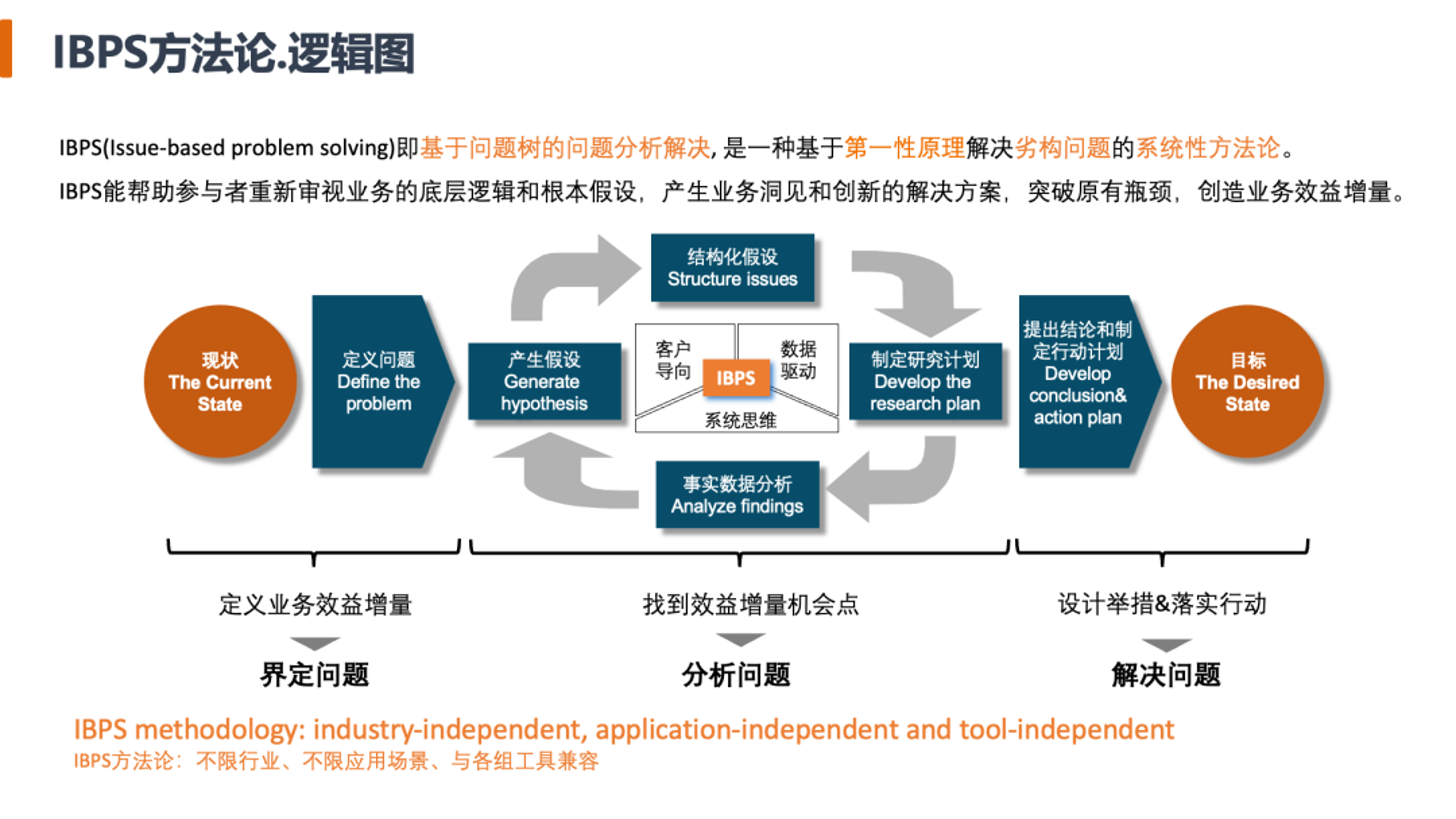 IBPS是国际顶尖咨询公司(MBB、Big4...)解决复杂商业问题底层方法论IBPS不限于任何行业、任何应用场景,可与其它工具方法适配,是方法论的方法论。
