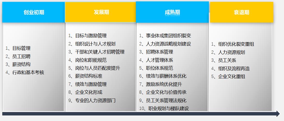 创业初期:1、目标管理2、员工招聘3、薪资结构4、行政和基本考核。。。。。。