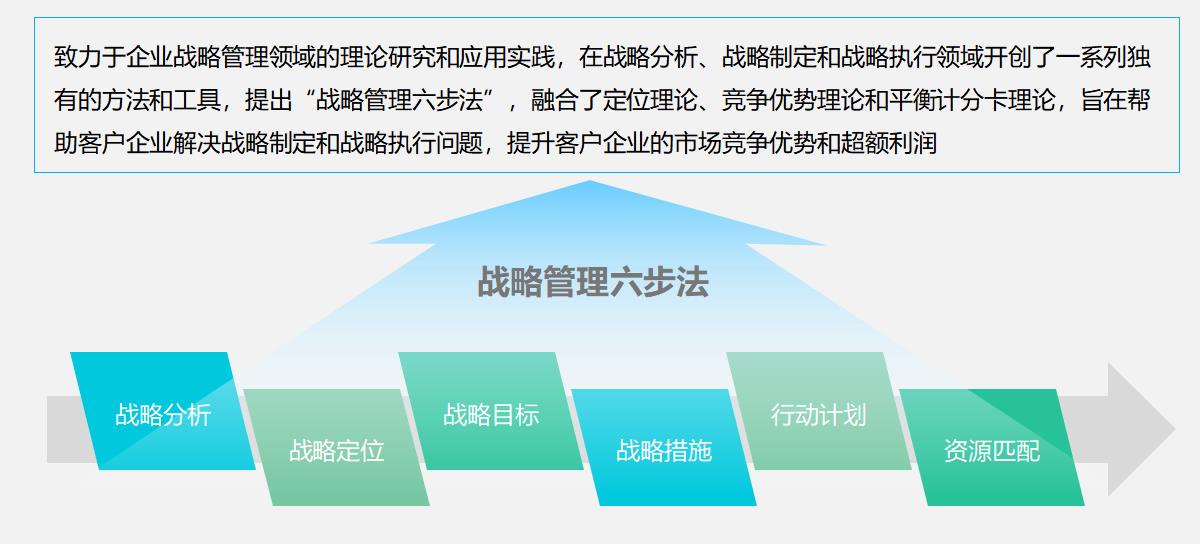 致力于企业战略管理领域的理论研究和应用实践,在战略分析、战略制定和战略执行领域开创了一系列独有的方法和工具,提出“战略管理六步法”,融合了定位理论、竞争优势理论和平衡计分卡理论,旨在帮助客户企业解决战略制定和战略执行问题,提升客户企业的市场竞争优势和超额利润。